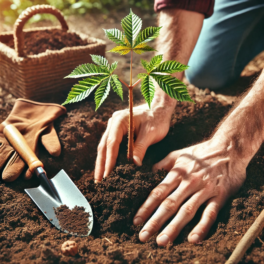 - 묘목 심기: 묘목을 땅에 20~30cm 깊이로 심은 뒤 흙을 덮고 가볍게 눌러 고정합니다.