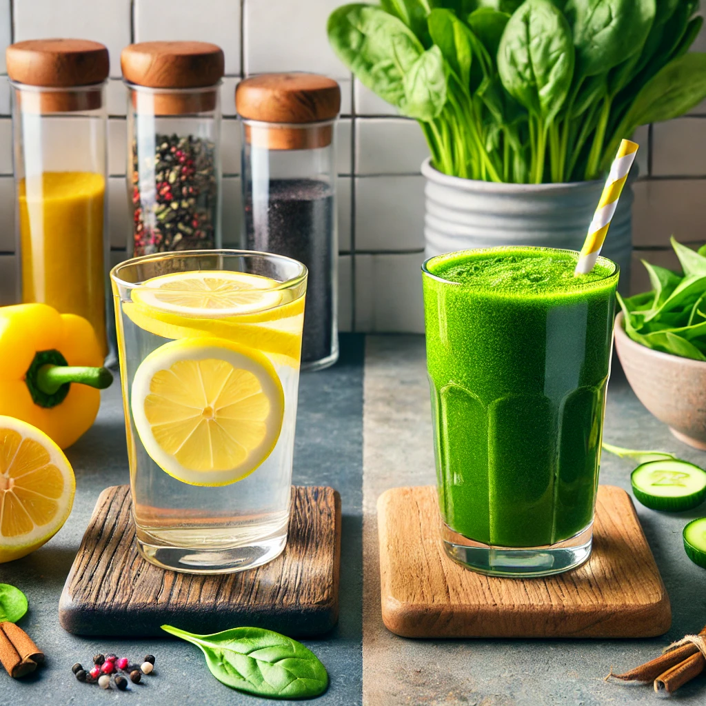녹즙은 엽산과 비타민 K가 풍부하지만, 레몬물에 비해 칼로리가 높고 맛이 강해 장기간 섭취하기 어려울 수 있어요.