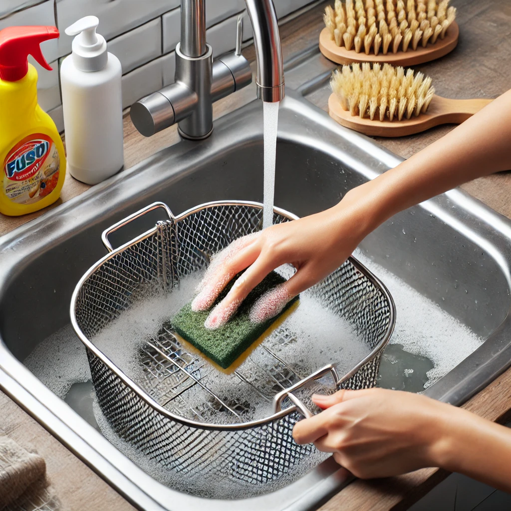 - 따뜻한 물에 주방세제를 풀어 바스켓과 팬을 담가두세요.